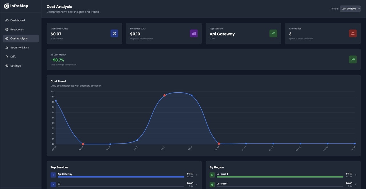 InfraMap automatically detects cost anomalies:- Sudden cost spikes - Alerts when costs increase unexpectedly