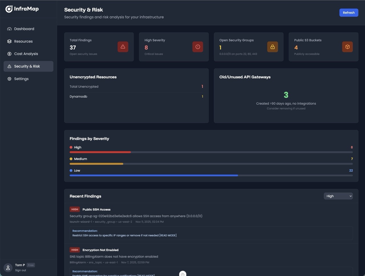 Here’s an example of how InfraMap presents security findings: Finding: Security group with SSH (port 22) open to the internet (0.0.0.0/0) What it means: Your EC2 instances are accessible via SSH from anywhere on the internet, allowing anyone to attempt to connect. Why it’s important: Open SSH ports expose your instances to brute force attacks. If credentials are weak or compromised, attackers can gain unauthorized access to your systems, potentially leading to data breaches, compliance violations, or malicious activities like cryptocurrency mining. Impact:- High risk - Potential unauthorized access to EC2 instances
